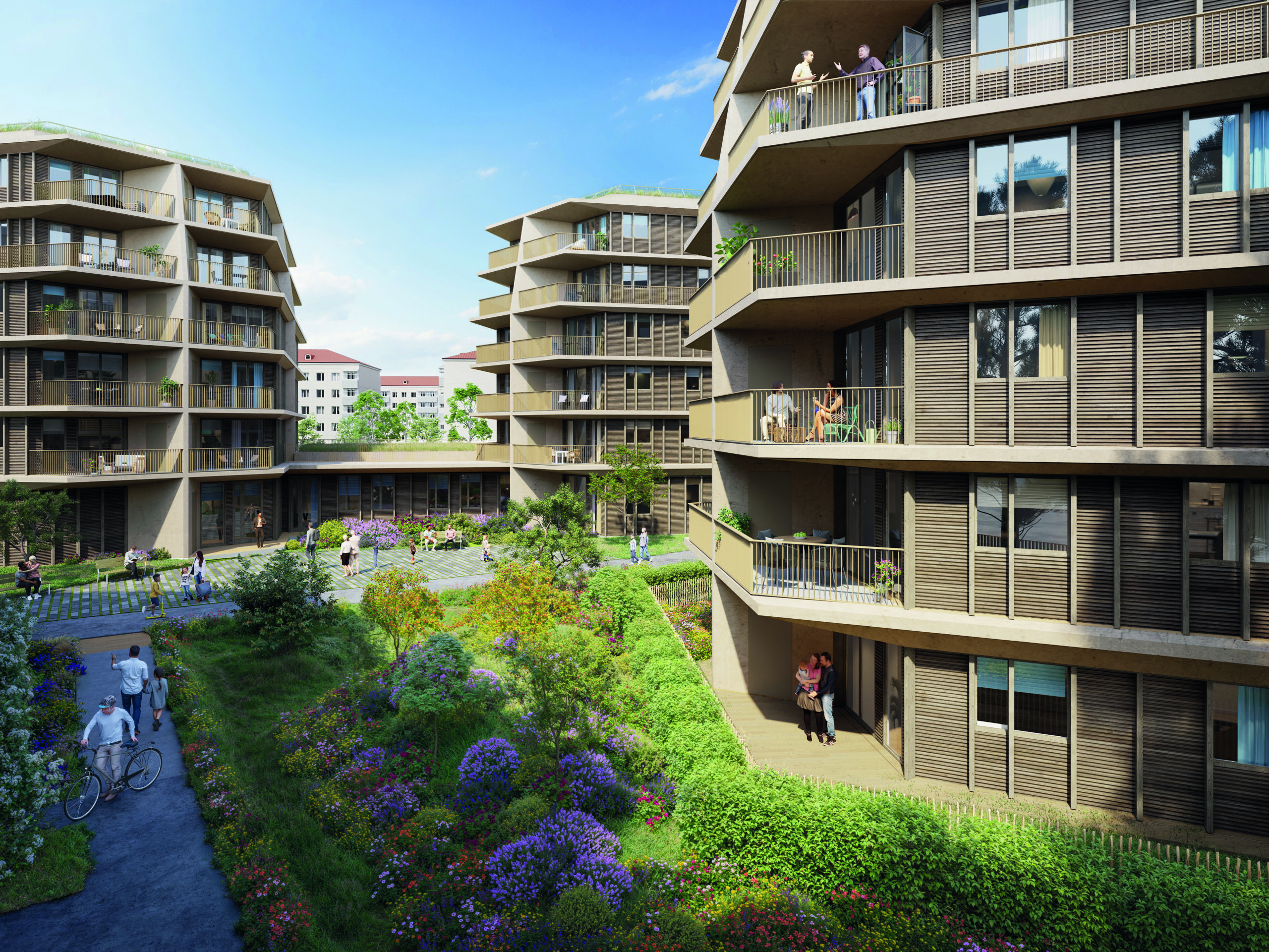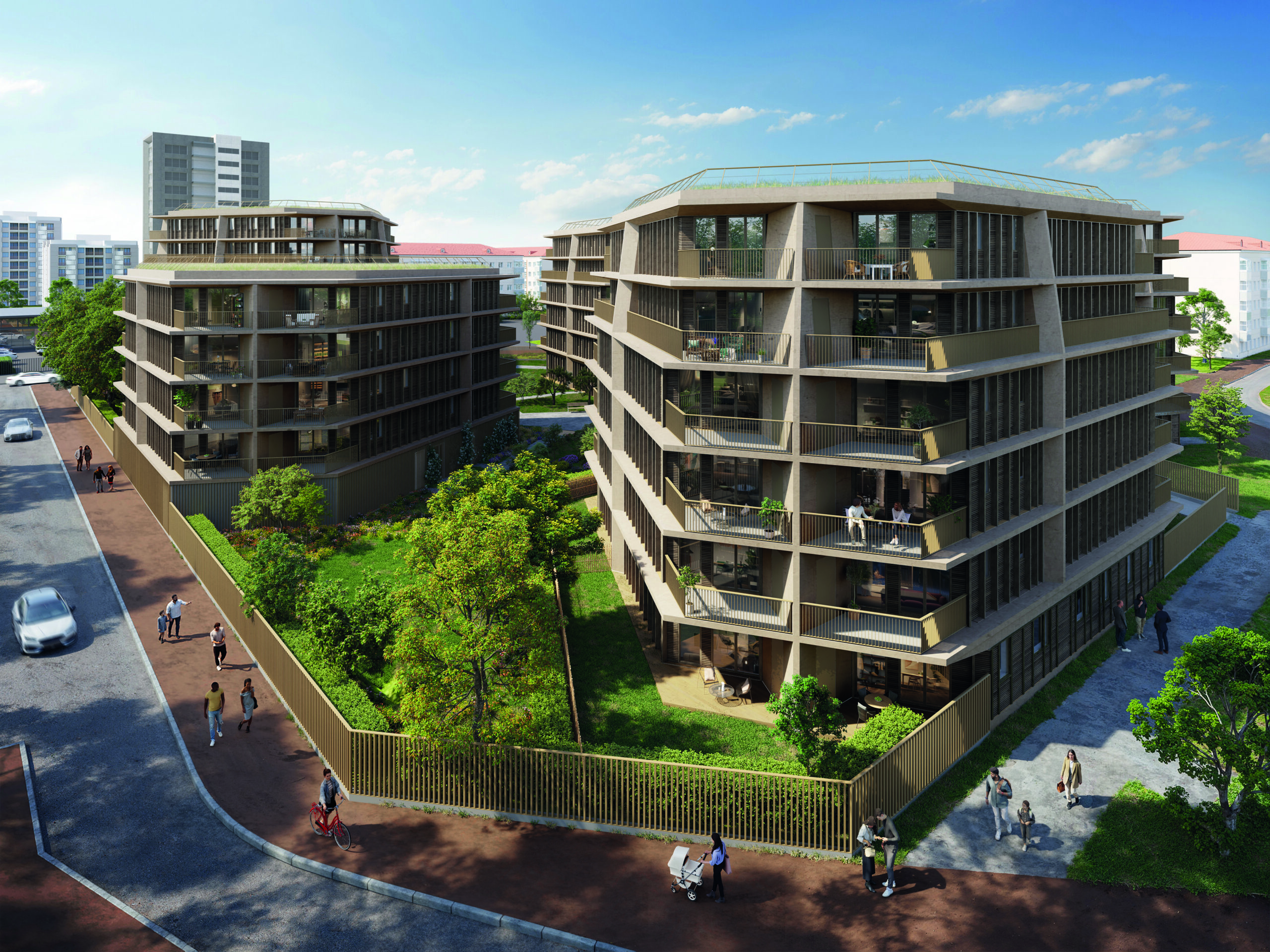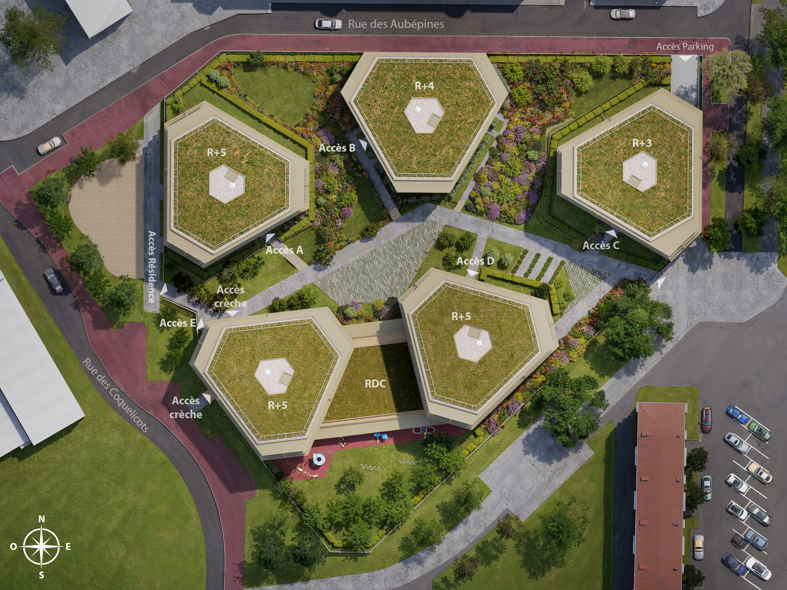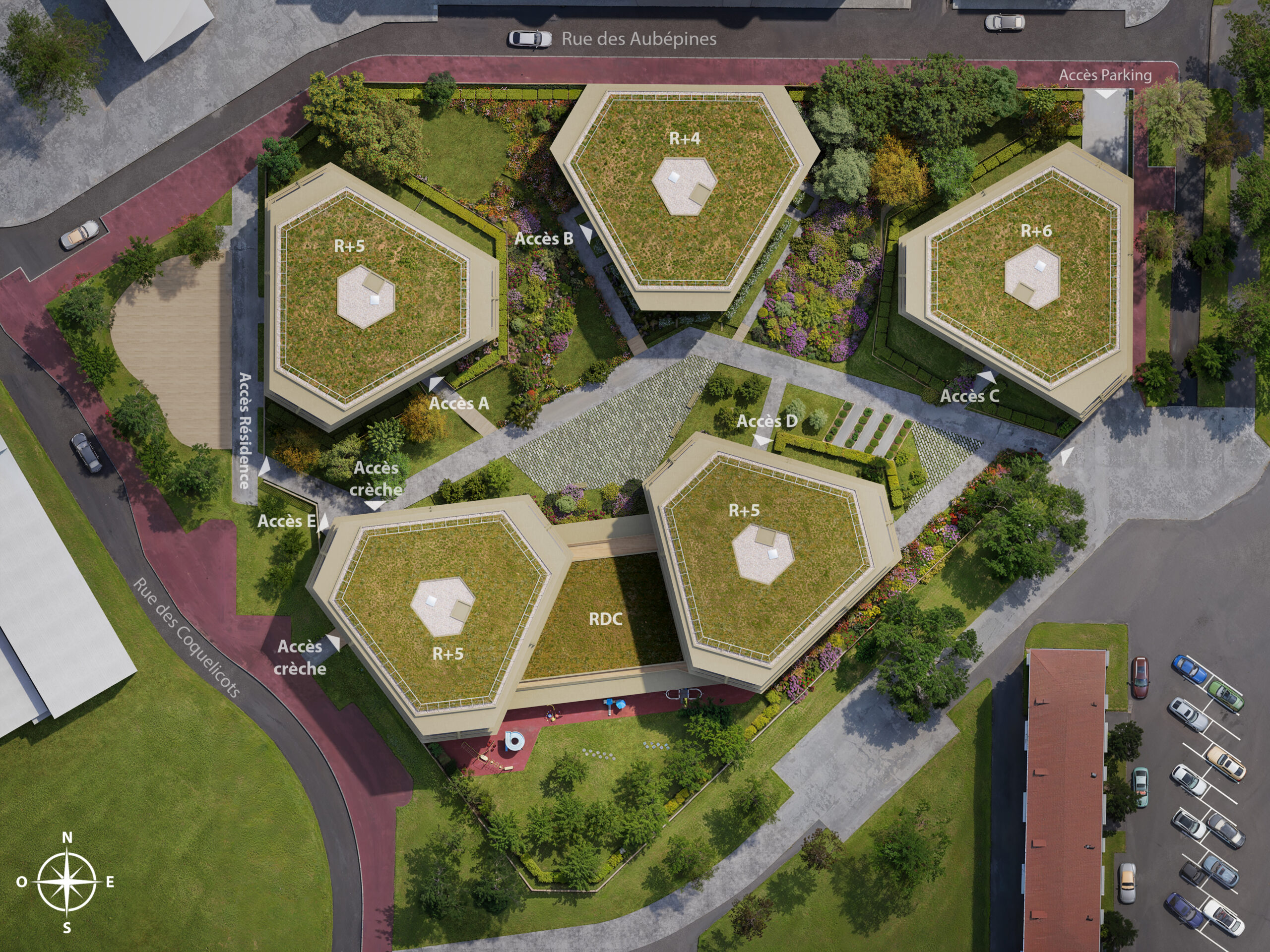 Un écrin de verdure : plus de 3 600 m² d’espaces libres, dont 1 800 m² plantés en pleine terre, avec 65 arbres (existants et nouveaux). Le coeur de la résidence s’anime autour d’un jardin collectif avec potagers, d’un square convivial et d’une placette arborée ouverte sur la coulée verte.